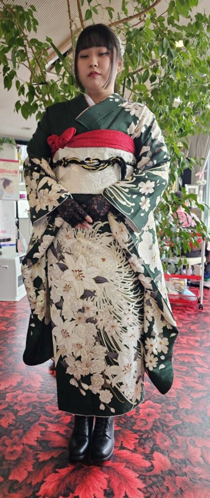 シンプルなポニーテール×黒髪が統一感のある髪飾りと帯、振袖にぴったりです💓
