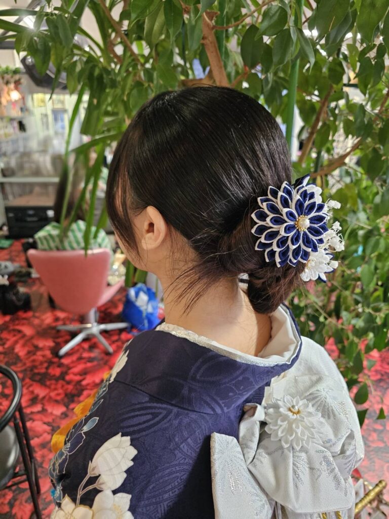 黒髪にぴったり、タイトシニョン🌟和の花飾りが着物にもあっています🌟