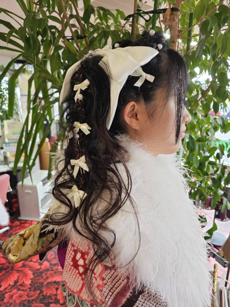 大きい白のリボン、小さい白のリボンが可愛い💓顔周りはサイドからぐるっと編み込みにカチューシャのようなデザインでトレンドを取り入れて