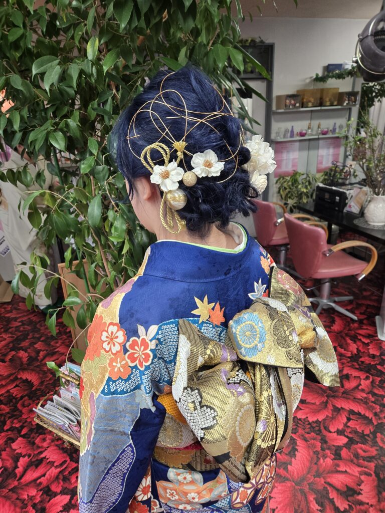 お着物と同じカラーブルーに、水引きと組み紐、花を散らしおめでたくアレンジ