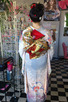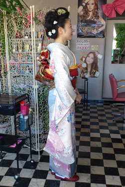 お母様が若いときに着ていた、古典的でとても素敵な着物だったので、そこを活かし、古典調のなかにも、今を取り入れた着付、若々しいながらも、モダンな感じのアップスタイルに仕上げています。