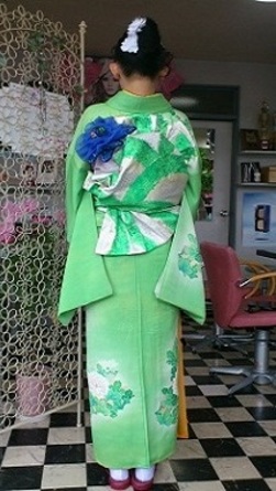 今日はいとこの結婚式にお呼ばれのお客様♪ お母様、ご親戚の方のたくさんの着物から選び抜いて、素敵に仕上がりました。セットも着付けも、お祝い事なので、飾りもたくさん使って華やかに、かつ上品に♪ グリーンがとってもお似合いです(^O^)