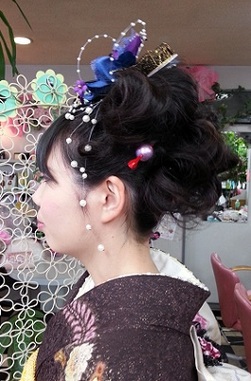 おしとやかで大和撫子のような雰囲気の似合うお客さまは、面を綺麗に生かしつつも、毛先はカールで遊ばせ、和風な中にも少し遊びのきいたスタイルになっています。着付も帯結びも個性を活かし、あでやかに♫お肌もとっても綺麗なお客様、今日はしっかりメイクもして、大人の女性の仲間入りです。