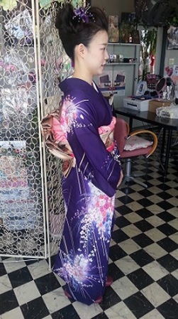 お母様の素敵なお着物をお借りして、娘さんも、成人式以来のお着物でのお呼ばれです!濃いめのお着物の色味に、鮮やかに散りばめられた柄が、色の白いお客様の肌をより一層美しく見せ、素敵です!お着物に合わせ、ヘアセットは面を綺麗に出しつつも遊びをきかせ、変わり結びも豪華に仕上がっていて、とってもお似合いです(^_^♪