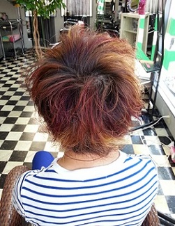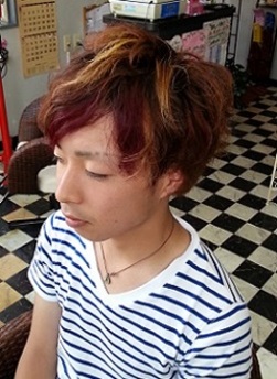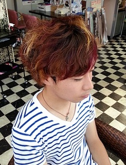 赤のマニキュアと、ブリーチでポイント的に色を入れ、個性的で遊び心が入ったオシャレな仕上がりになりました!クセ毛を活かして、セットすることで、カッコよさに磨きがかかり、さらにセンスアップ♪