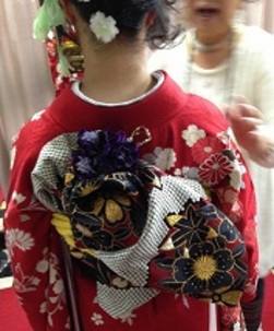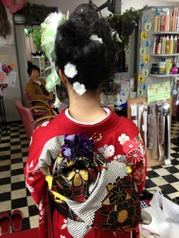 ♪今日から大人の仲間入り♪斜めのラインでカールを作り、アシンメトリーにまとめたアッツプスタイル、帯も立矢系の変わり結びでスッツキリ、愛らしく作りあげました♪♪ 流れる様なラインは〝流石先生〟