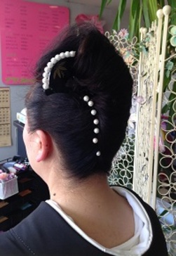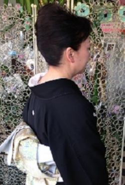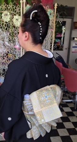 髪は夜会をアレンジして、上品にしました。帯結びは、お太鼓の変わり結びです。