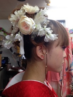 成人式のアップスタイルは、可愛い系で、帯結びは、文庫の変わり結びです(^^♪