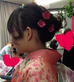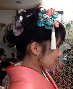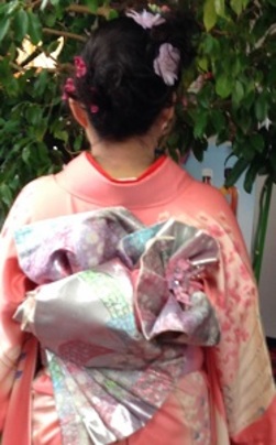 襟足をすっきりあげ、短さを感じさせない正統派アップ♪♪ピンクの振袖にぴったりの可愛い帯結び晴れの一日楽しんでね(^_-)-☆