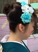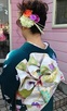 成人式前撮り、アップは、サイドとえりあしはタイトに仕上げ、カールツヤ感をだしました(^_-)-☆帯は、飾りと同じ花をアレンしました。