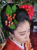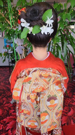 日本の伝統的な美しさを感じさせる「日本髪」で、凛々しく整えられた、どこから見ても美しいヘアアレンジです。髪飾りの生花も素敵です。造花の花よりも色鮮やかで香りも楽しむことができます。 帯結びはだらりとたらし舞妓さん風にアレンジしてみました♡