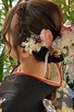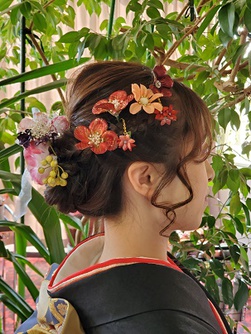 耳下にまとめて大人っぽい印象に仕上げました。全体に散りばめられた花飾りとリボンをつけてガーリースタイルに♡